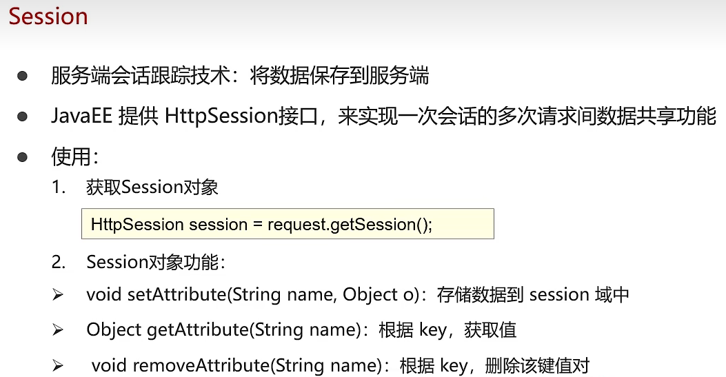 | @WebServlet(name = "SessionDemo2", value = "/SessionDemo2") public class SessionDemo2 extends HttpServlet { @Override protected void doGet(HttpServletRequest request, HttpServletResponse response) throws ServletException, IOException { HttpSession session = request.getSession(); Object username = session.getAttribute("username"); System.out.println(username); } }