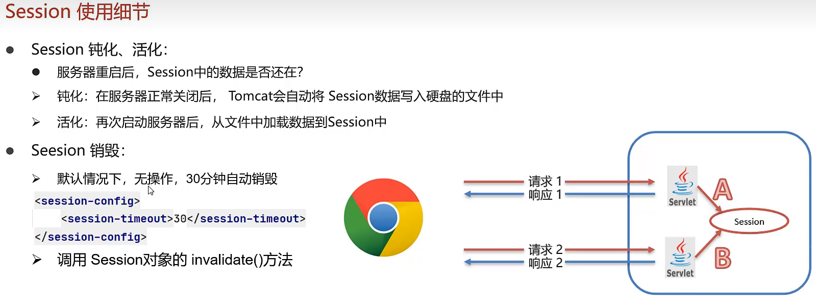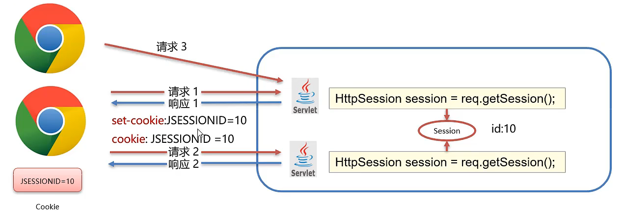 | @WebServlet(name = "SessionDemo1", value = "/SessionDemo1") public class SessionDemo1 extends HttpServlet { @Override protected void doGet(HttpServletRequest request, HttpServletResponse response) throws ServletException, IOException { HttpSession session = request.getSession(); session.setAttribute("username", "NewUserSession"); } @Override protected void doPost(HttpServletRequest request, HttpServletResponse response) throws ServletException, IOException { } }