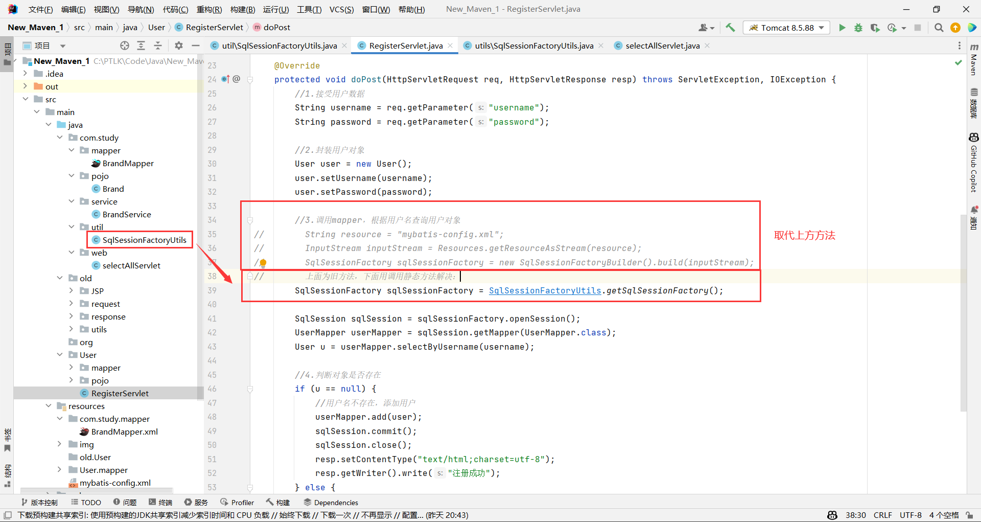 SqlSession sqlSession = sqlSessionFactory.openSession(); UserMapper userMapper = sqlSession.getMapper(UserMapper.class); User u = userMapper.selectByUsername(username);