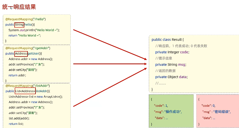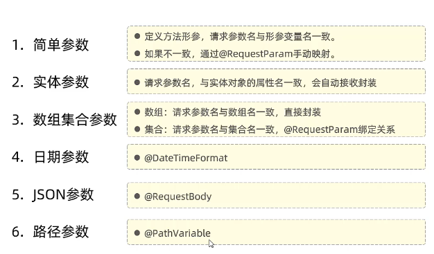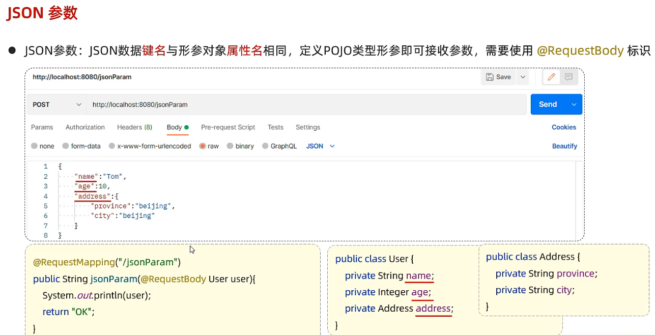 JSON参数:JSON数据键名与形参对象属性名相同,定义pojo类型形参即可接收参数,需要使用@RequestBody标识