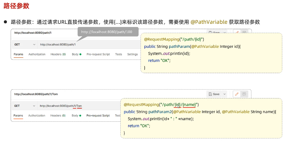 路径参数:通过请求 URL 直接传递参数,使用 {…} 来标识该路径参数,需要使用 @PathVariable获取路径参数